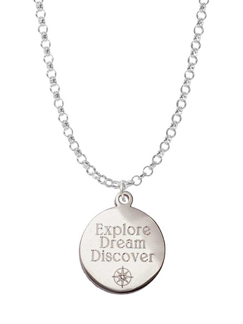 Engraved Explore Dream Discover Disc - Charm Necklace. Engraved Explore Dream Discover Disc is approximately 0.74 x 0.62 x 0.07 inches (HxWxD) including loop. This stainless steel charm looks great and will not tarnish. This elegant silver-plated chain necklace measures 19 inches in length and features a 2-inch extender chain, allowing for adjustable wear. The necklace is adorned with a charming pendant and secured with a reliable lobster claw clasp. Its versatile design makes it perfect for layering with other necklaces or wearing solo, enhancing any outfit with a touch of sophistication. PLEASE NOTE: Our products are not intended for children 14 years and younger.